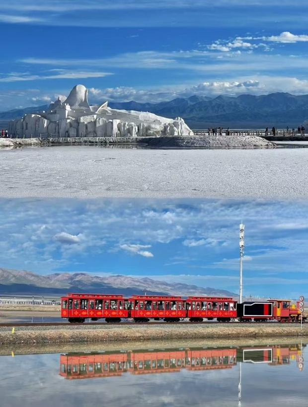 湛藍(lán)天空與澄澈湖水相互交融,讓人有一種置身于水中的錯(cuò)覺。走在上面,就像是踏入了一片虛無的天地,不知是天落在湖里,還是湖與天相擁。鹽湖軌道,就像是一條時(shí)間通道,連接著那個(gè)神秘的世界。南北兩條軌道,北面是游客進(jìn)出湖心的期待,南面是神秘莫測的茶卡。坐在小火車上慢慢前進(jìn),藍(lán)天白云,白色鹽湖,以及遠(yuǎn)處連綿起伏的群山,組成了一副壯麗的畫面,這輛小列車承載著我們進(jìn)入這幅畫,仿佛置身于《千與千尋》的夢幻場景里,駛向那未知而美好的遠(yuǎn)方。