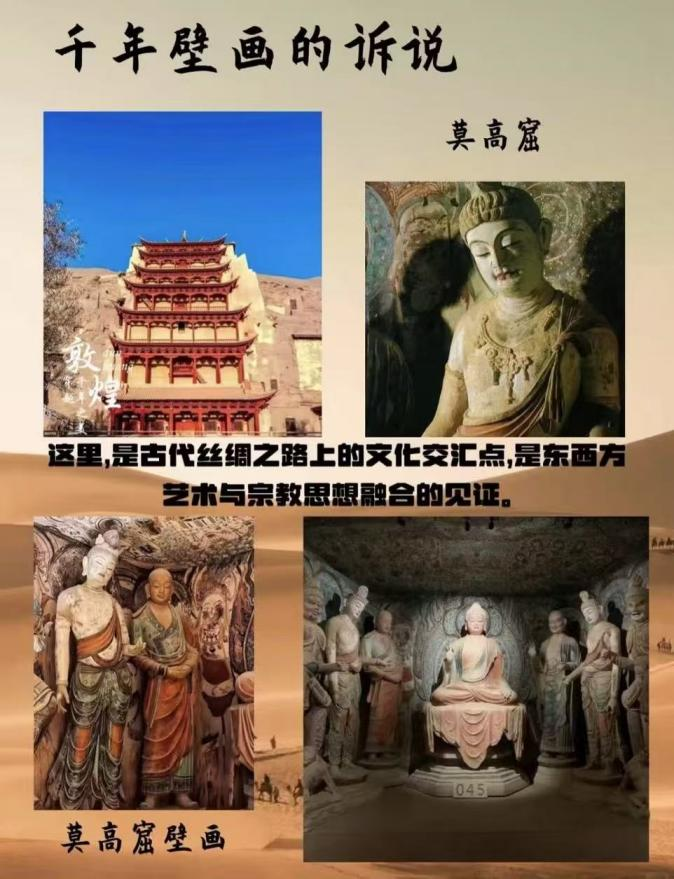 佛光穿過絲綢之路上的風(fēng)沙,凝結(jié)了人類的虔誠和智慧。風(fēng)沙侵蝕的懸崖之下,每一顆沙粒,都承載著一份文明的厚重。行走在洞穴中,歲月從筆尖流淌而過。北朝的飛衣姿態(tài)優(yōu)美,衣袂飄飄,盛唐的佛像,低垂著眼簾,微笑著,掛著如銀河般的項(xiàng)鏈。五代的供養(yǎng)人服飾華美,眉間隱有絲綢之路行商的傳說。朱砂、石青、金箔在斑駁之中,依然燦爛。佛祖拈花一笑,飛天彈起琵琶,《經(jīng)變圖》中,蓮池漣漪。敦煌,不只是一面石墻,更像是一部以顏色繪就的宏大史詩。